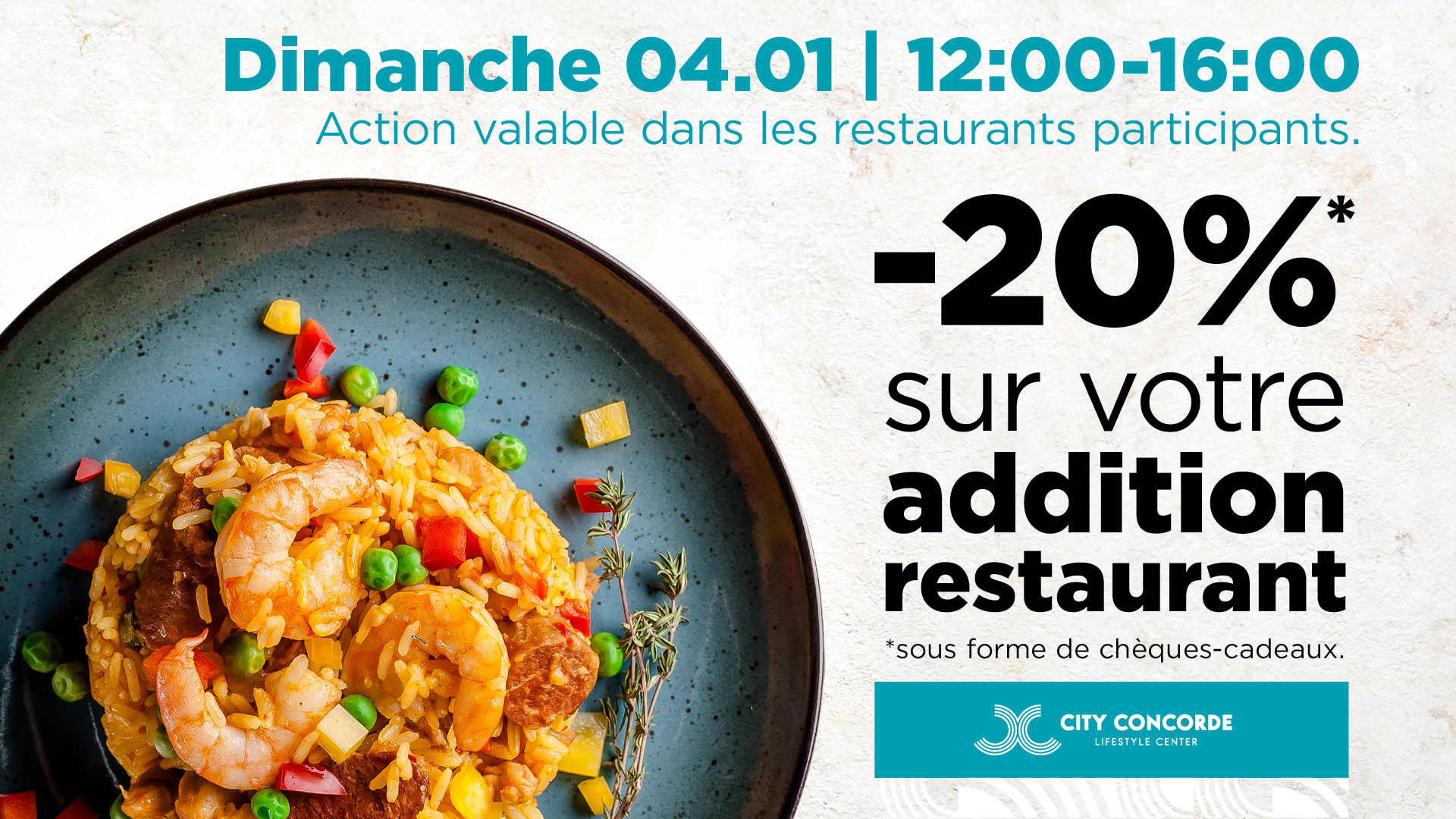 Une remise de -20% sur le montant de votre addition du restaurant vous sera remboursée sous forme de chèques-cadeaux City Concorde*, le dimanche 4 janvier 2026 uniquement entre 12:00 et 16:00.COMMENT PARTICIPER :